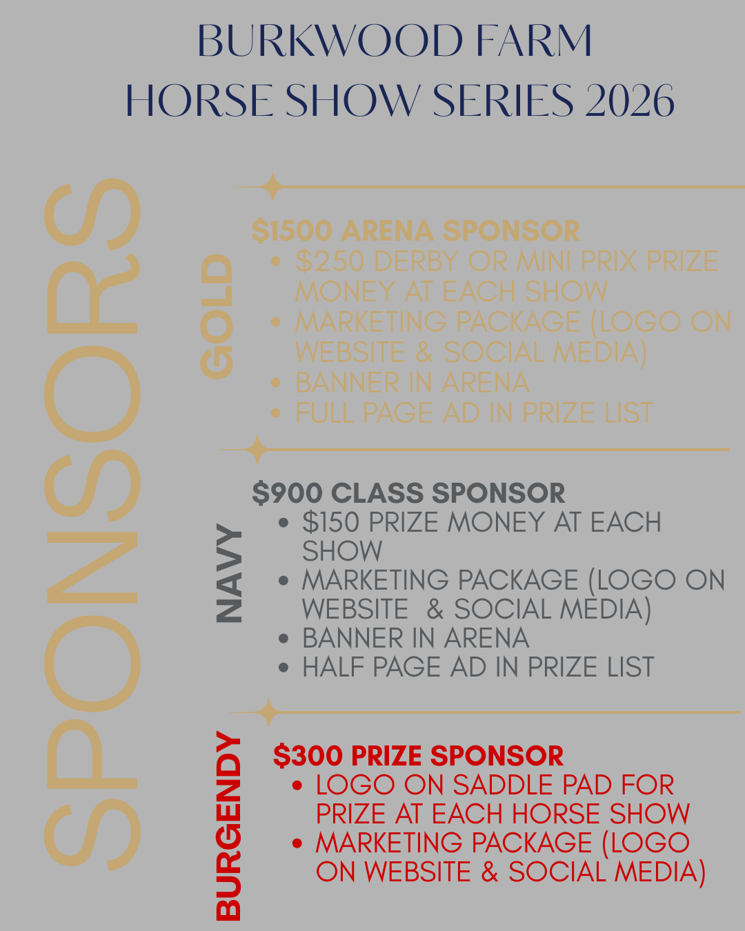 Check out our prizelists and the open Classic sponsorships. Pick your class from hunter day or jumper day to promote your barn or business. Message Paige for more info - Burkwoodfarms@gmail.com
